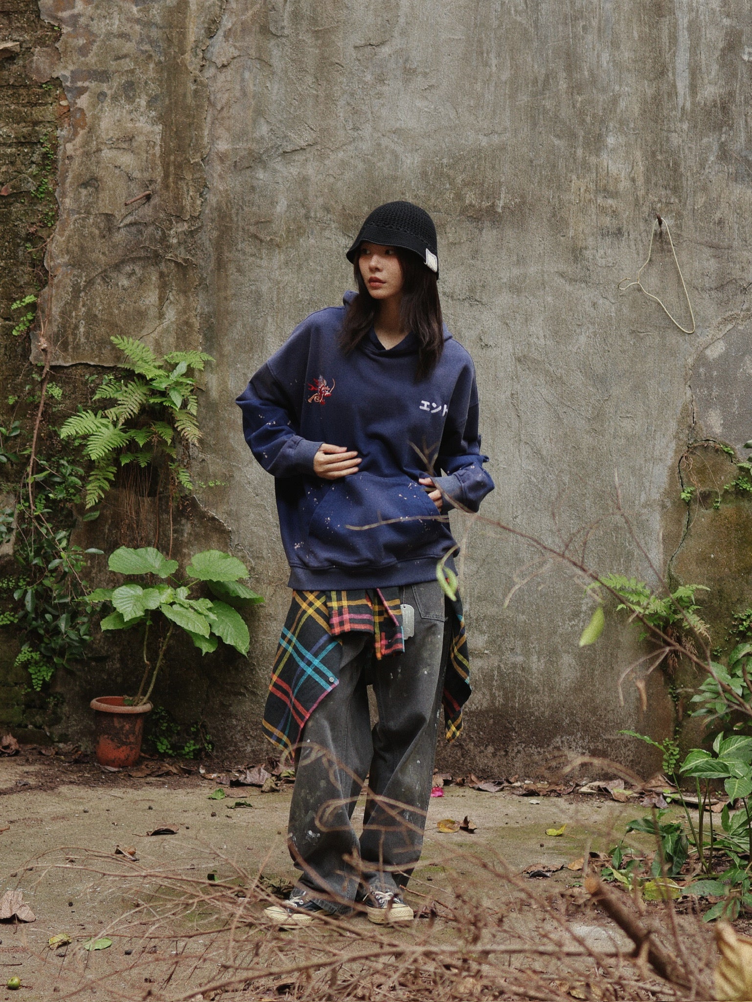 連帽衫經復古洗舊處理,共有黑、藍兩色。